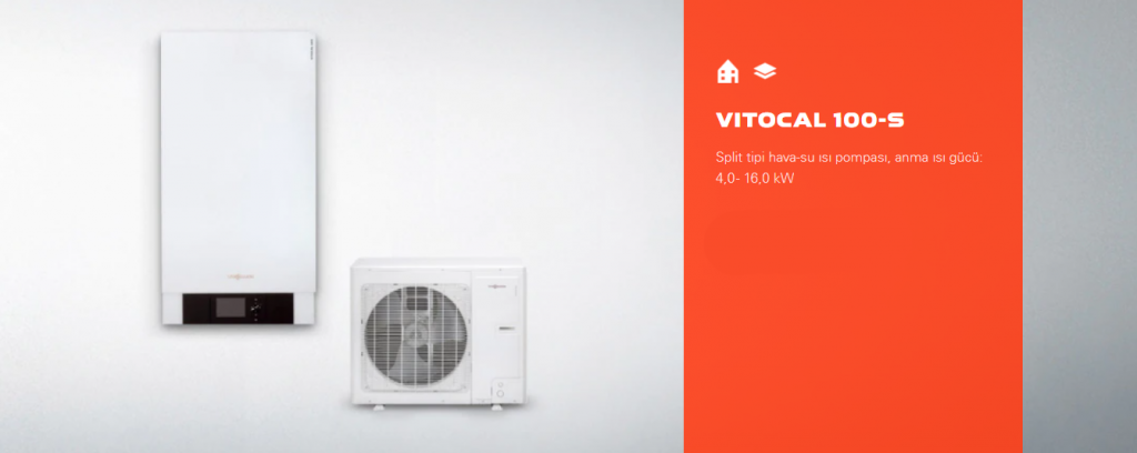 Split tipi hava-su ısı pompası Vitocal 100-S iki ayrı üniteden oluşur: Dış ünite ortam havasını, bir kompresör tarafından ısıtma için gerekli sıcaklığa getirilen bir soğutucu ısı vasıtasıyla evaporatörden geçirir. Isı, iç üniteye bir boru aracılığıyla gider ve burada ısıtma şebekesine kondenser aracılığıyla aktarılır.